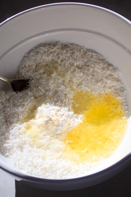 1. Combine the coconut, sugar, flour and salt together in a large bowl.